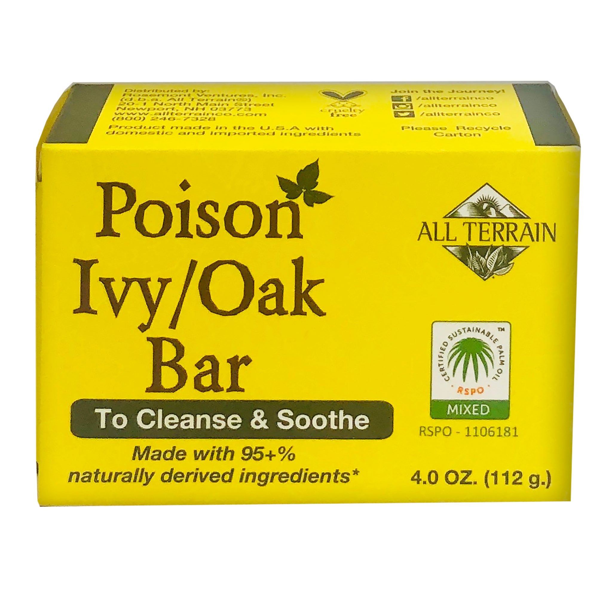 Poison Ivy/Oak Bar is specially formulated with 95+% naturally derived ingredients to help cleanse, soothe and calm itchy, irritated skin due to poison ivy, oak or sumac. Environmentally friendly Poison Ivy/Oak Bar contains natural, nourishing oils and extracts, such as neem oil, tea tree oil, soybean oil, sunflower oil, plantain extract, oat extract, rosemary extract and RSPO certified palm oil to relieve & soothe itchy, irritated skin that affected by poison ivy, oak or sumac.
